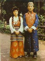 The traditional outfit of Bhutias is called a bakhu (similar to the Tibetan chuba, but sleeveless) which is a loose cloak type garment that is fastened at the neck on one side and near the waist with a silk/cotton belt. Male members array the bakhu with a loose trouser. The womenfolk don the bakhu with a silken full sleeve blouse called honju; a loose gown type garment fastened near the waist, tight with a belt. In the front portion a loose sheet of multi-coloured woollen cloth with exotic geometric designs is tied. This is called the pangden and is a symbol of a married woman. This traditional outfit is complemented by embroidered leather boots by both men and women. Bhutia women enjoy a much higher status than their counterparts from other communities. Both women and men have a special weakness for gold in its purest form and, traditional jewellery is mostly made of 24 carats (100%) gold.